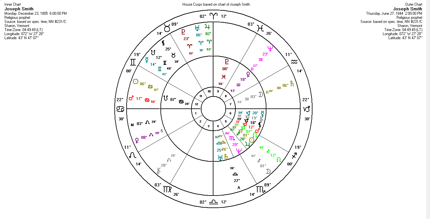 The resentment to Mormonism can be seen in transiting Jupiter and Uranus (both together) square Joseph Smith’s natal Sun. They are in the 10th House representing community affairs. ** These squares show his religious ideas will not be generally accepted and will be unsettling—violently so– to much of the public.